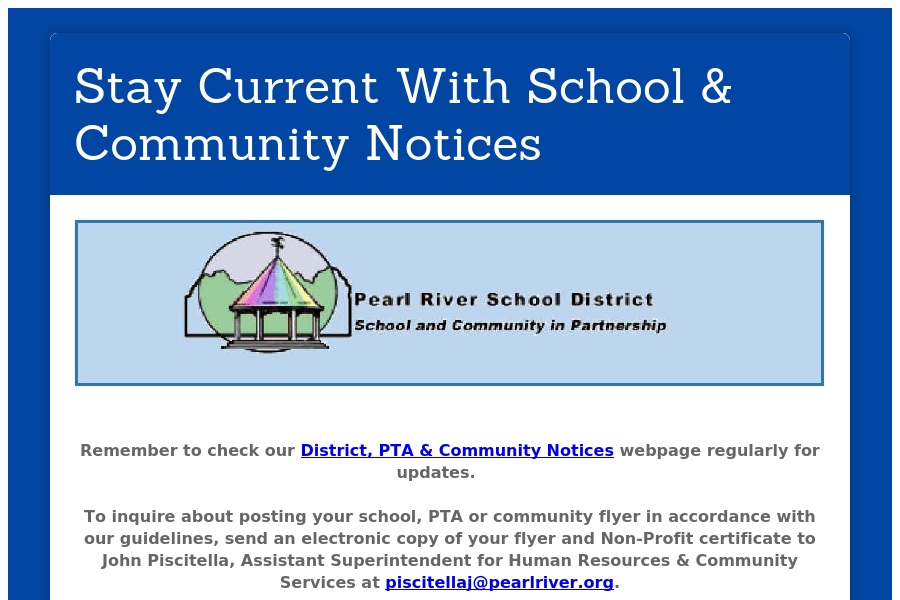 Stay Current With School & Community Notices Remember to checkour District, PTA & Community Notices webpageregularly for updates. To inquire about posting you. . .